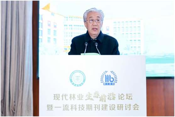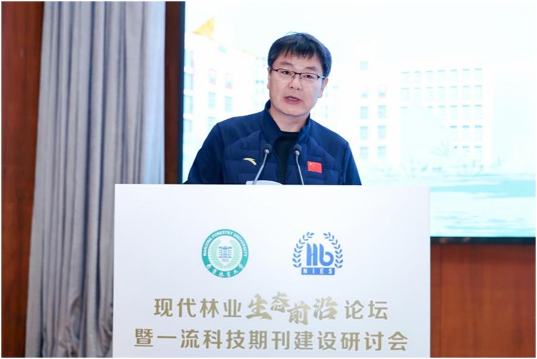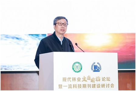 李维新在致辞中介绍了生态环境部南京环境科学研究所在生态保护修复、生物多样性智慧监测、森林碳汇精准核算等方面的科研成果与实践应用。他表示,林业是生态安全根基与绿色发展命脉,研究所将以本次论坛为契机,持续深化与我校及全国同行的产学研协同合作,共研关键技术、共推成果转化,为现代林业高质量发展提供坚实科技支撑。